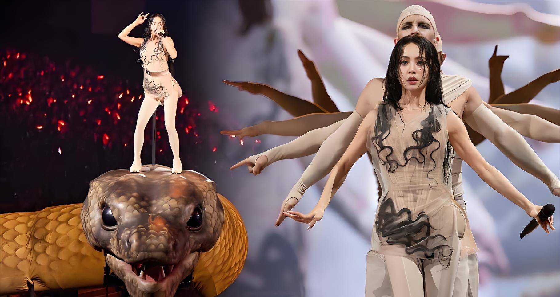 这套舞台灵感源自中世纪名画《人间乐园》,本身就充满强烈象征意味,再加上巨型蛇、公牛等元素,被做成360度无死角的超大型装置,视觉压迫感极强。对部分观众来说,这样的氛围不仅谈不上享受,反而容易产生不适。