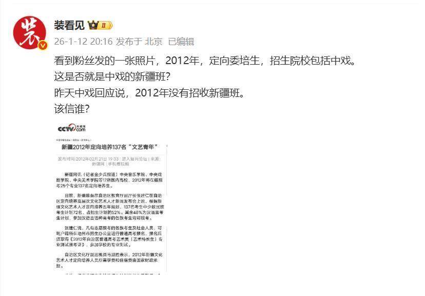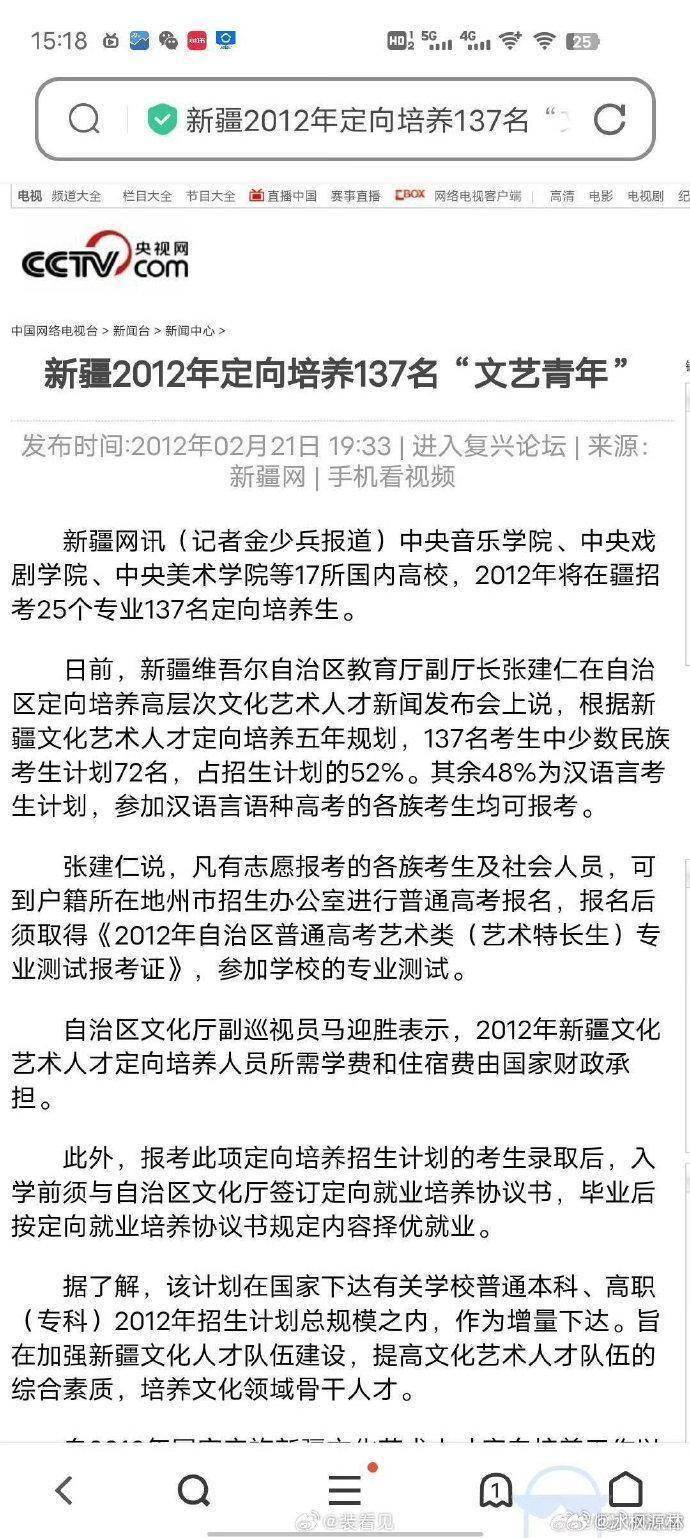 本以为这事儿该随着辟谣和道歉收尾了,结果第二天就有博主甩出猛料:粉丝发来的2012年旧闻截图显示,当年新疆要定向培养 137 名文艺青年,招生院校赫然列着中央戏剧学院。