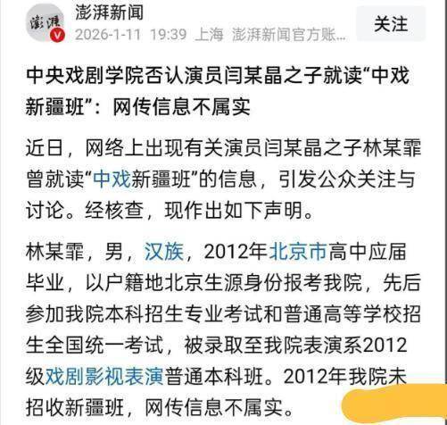 1月11日晚上,中央戏剧学院的一则声明把演员闫学晶推上了热搜浪尖。声明里写得明明白白:“林某霏以北京生源身份被录取至表演系普通本科班,2012 年我院未招收新疆班,网传信息不属实”。