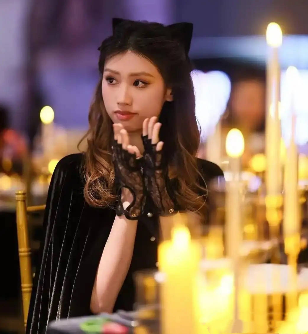 丝绒斗篷、蕾丝手套、猫耳造型,她坐在台下美得像个精灵。