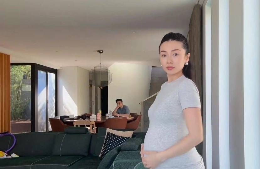 程晓玥换上修身的孕妇装,孕肚就更明显了。老公坐在一旁看着她,满眼都是爱慕。