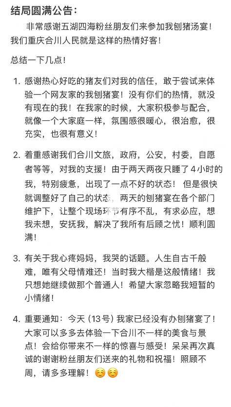 好在有企业和网红主动捐了三头猪。流水席才勉强开了起来。