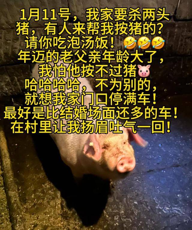 1月9日,重庆合川博主呆呆发了条视频。视频里她求助,七旬老爸杀不动年猪,想请网友来搭把手,管顿地道刨猪汤。