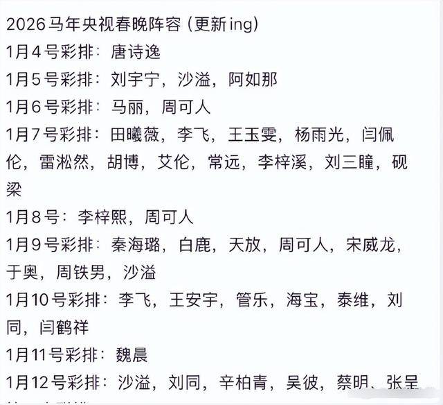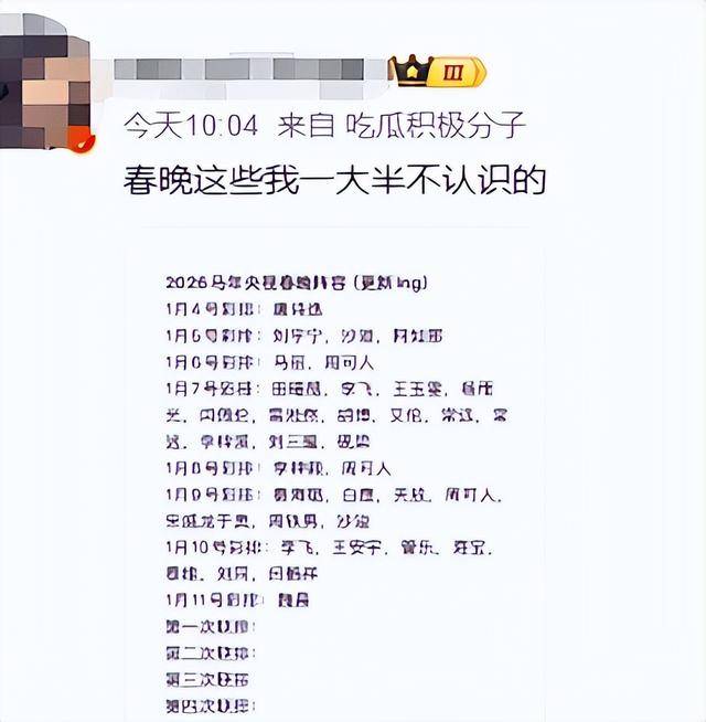这份横跨1月4日到12日的彩排名单里,不少名字让观众感到陌生,中老年群体更是直呼找不到熟悉的面孔,失望情绪在网络上不断蔓延。