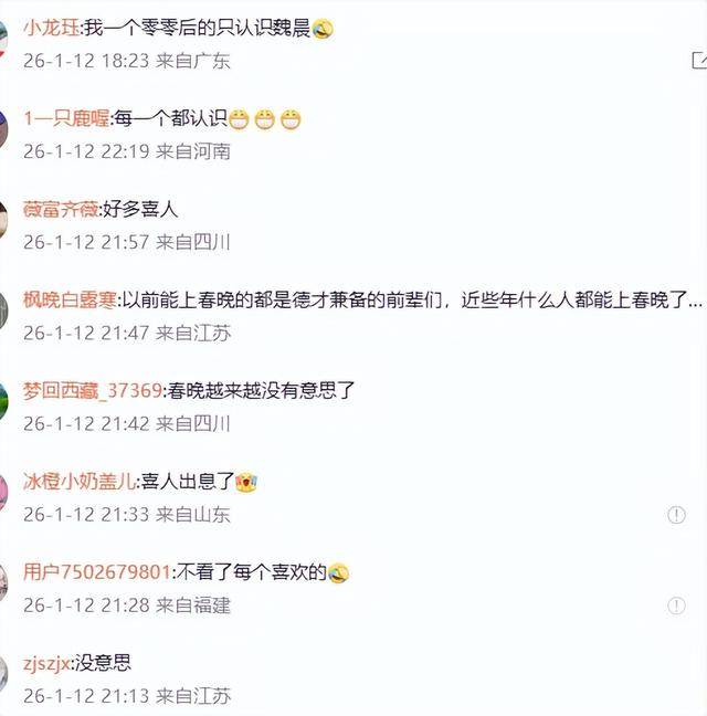 “名单上的明星大半都不认识,春晚越来越没那味儿了”、河南网友表示“想看的老艺术家一个都没有,实在提不起兴趣”、“连明星都认不全”等等。
