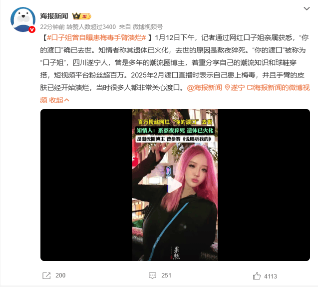1月12日下午,记者通过网红口子姐亲属获悉,“你的渡口”确已去世。知情者称其遗体已火化,去世的原因是熬夜猝死。“你的渡口”被称为“口子姐”,四川遂宁人,曾是多年的潮流圈博主,着重分享自己的潮流知识和球鞋穿搭,短视频平台粉丝超百万。2025年2月渡口直播时表示自己患上梅毒,并且手臂的皮肤已经开始溃烂,当时很多人都非常关心渡口。