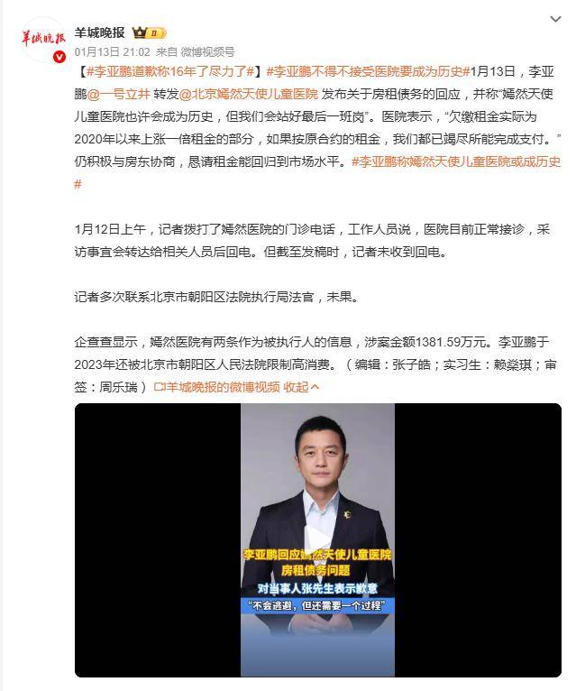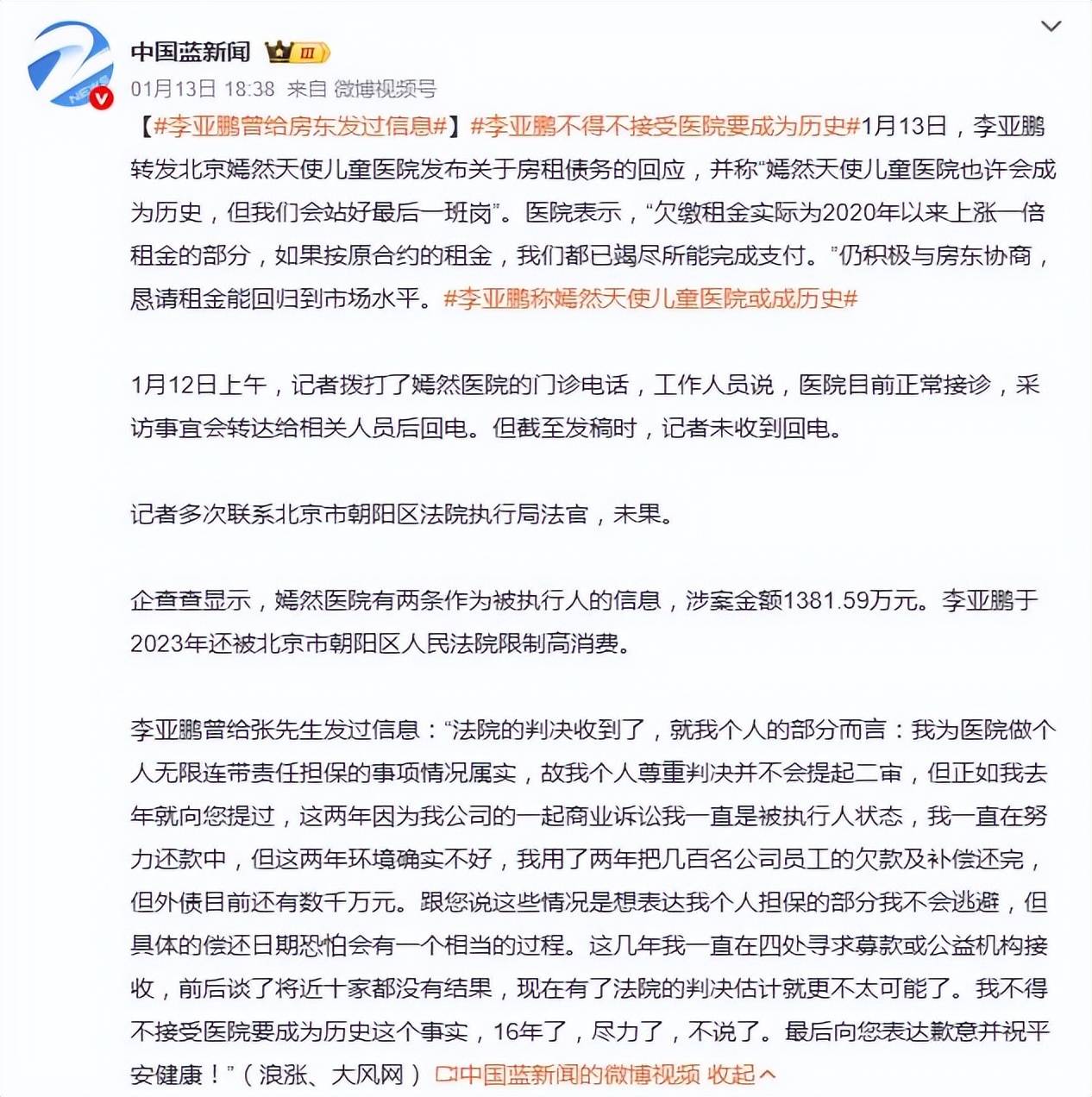 然而,紧随其后的三年特殊时期,给了医院沉重一击。门诊量腰斩,经营陷入困境。医院方面表示,他们已竭尽所能支付原合约租金,但对于翻倍后的部分,实在无力承担。截至2026年1月,欠缴的租金、房屋占用费及滞纳金累计已达2600余万元。法院两审判决要求医院腾退房屋并支付欠款,李亚鹏本人对其中270万元承担连带责任,他2023年也因此被限制高消费。