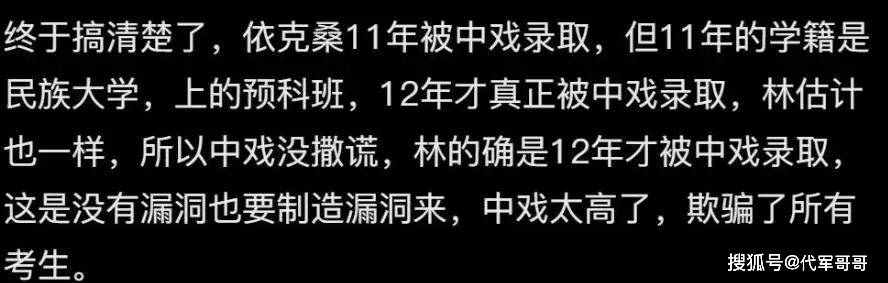 二次举报的核心依据随之浮出水面。网友通过公开资料查证发现,林傲霏所在的2012级中戏表演系普通本科班毕业合影中,有一位名为依克桑的同学,其履历明确显示为新疆维吾尔族考生,当年正是通过“新疆民考民定向预科转入”渠道入学。而根据中戏当年的招生计划,该渠道应有3个转入名额,但网友核实后发现,除依克桑等2名新疆考生外,剩余1个名额去向成谜。结合闫学晶“儿子报新疆班、分数低”的表述,网友合理怀疑,林傲霏正是占用了这一空缺的新疆专项名额,以低分违规入学。