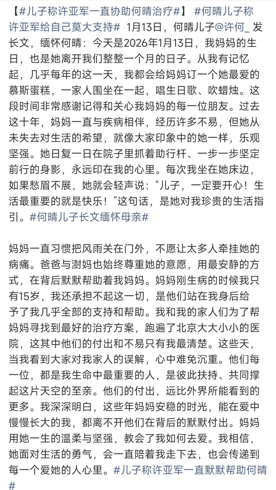 巧合的是,1月13日也是何晴生前的生日。她的儿子、青年男演员许何特意选择在这一天,在自己的社交平台上写下一篇长长的纪念文字,缅怀自己的母亲何晴。
