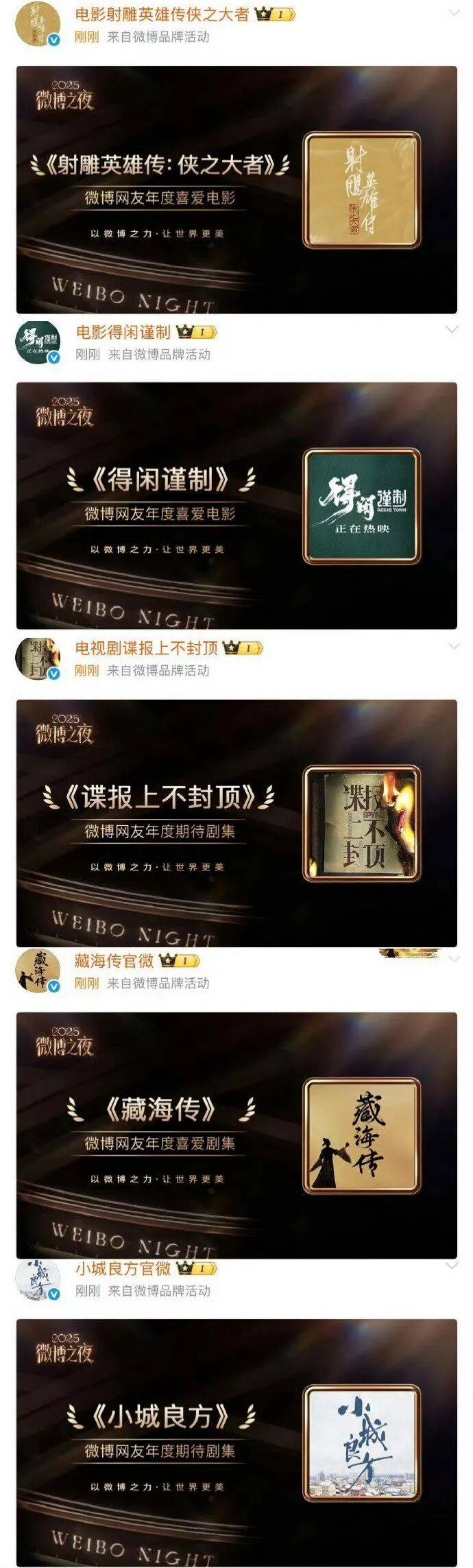 2025微博之夜线上评选于2026年1月12日揭晓结果,肖战凭借两部已上映电影、一部热播剧及两部待播剧共五部作品包揽五项荣誉,涵盖个人奖项、已播作品口碑及未播剧集期待值三大维