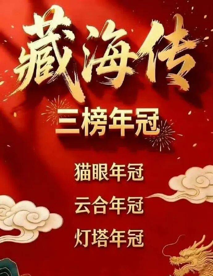 《藏海传》,央视八套近五年古装剧收视冠军,CVB平均1.469%,横扫灯塔、猫眼、云合三榜年冠,入选“年度喜爱剧集”。