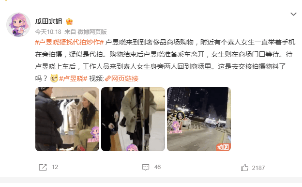 2026年1月13日,某八卦媒体发布视频:卢昱晓在奢侈品店购物时,一名素人女子持手机持续跟拍;卢昱晓乘车离开后,她工作人员折返商场并与该女子同行。部分博主将此解读为“交接拍摄物料”,质疑她自导代拍炒作。