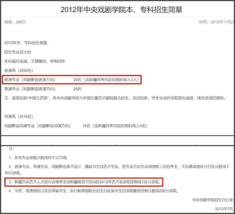 此前有网友扒出中戏2012年招生简章,显示2012级表本招收25人,含新疆民考民定向预科生转入3人,而当年新疆定向合格考生录取分数线是152分,低于普通本科。