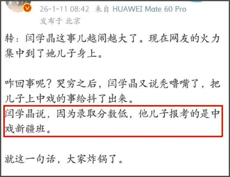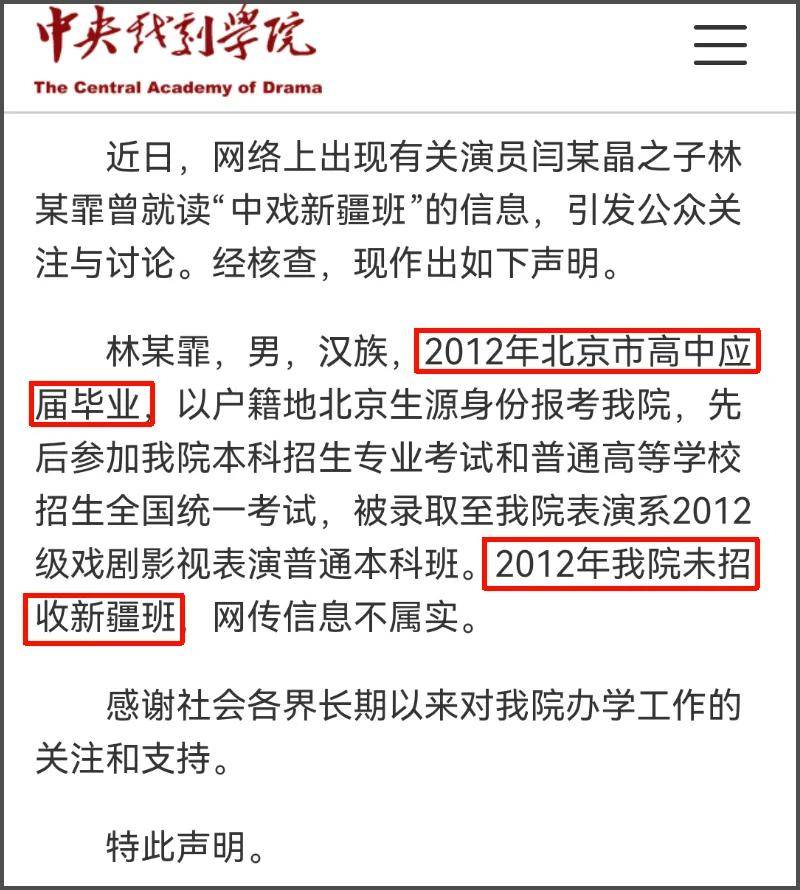 难道闫学晶作为孩子家长,连儿子高考到底考的什么班都记不清楚?中戏又白纸黑字写明2012年没招收新疆班。
