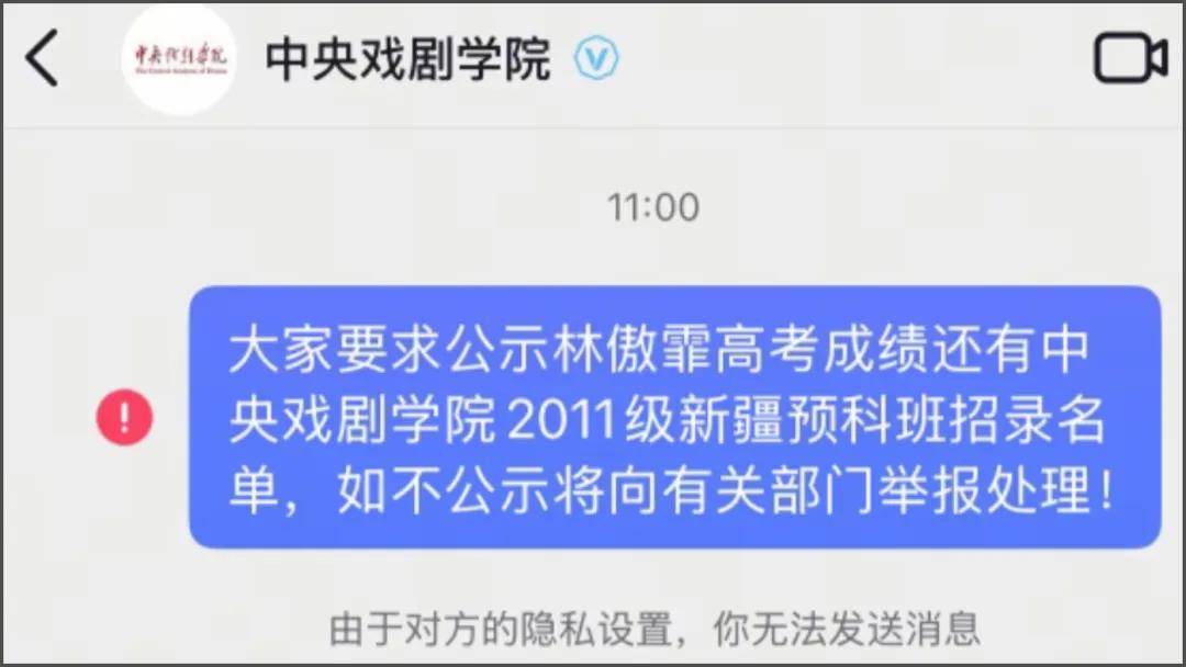 有网友直接私信中戏,要求公示林傲霏高考成绩,和同期新疆班预科班转入名单,如果不公示,网友将向有关部门举报处理。没想到中戏账号限制了私信和评论,网友想向中戏提建议都找不到渠道。