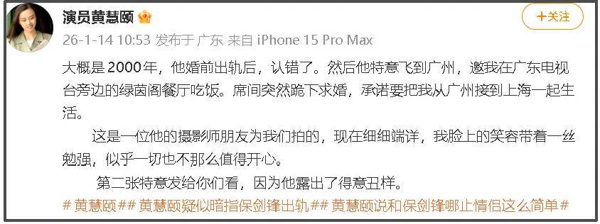 黄慧颐表示保剑锋是在2001年春节出轨,当时对方在电话中承认出轨且认错,还特意飞到广州请她吃饭,途中突然下跪求婚,承诺将她接到上海生活。
