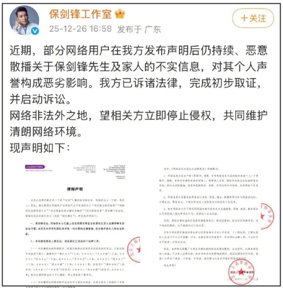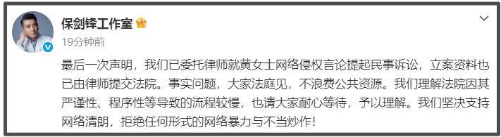 而后,保剑锋工作室发文回应,并表示是最后一次声明。工作室称已对黄女士侵权言论提起民事诉讼,相关程序在走流程比较慢,坚决反对任何形式的网暴和不当炒作,但并没有直接否认隐婚及出轨等爆料。