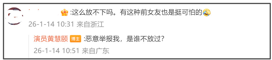 看到黄慧颐锤保剑锋多年前的出轨风波,有网友表示有这种前女友很可怕,过了这么多年还放不下。黄慧颐直接怼“恶意举报我,是谁不放过”,可见她的怒火。