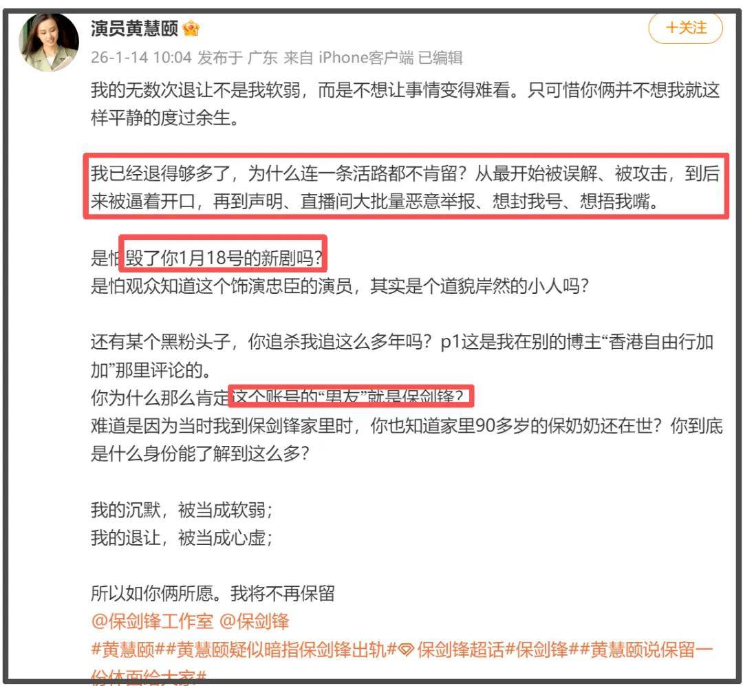 同时,黄慧颐还点名了某个长达十几年的黑粉,质问对方为何那么肯定“男友”就是保剑锋,又为何那么清楚他们家里事。对此,黄慧颐喊话保剑锋夫妻俩:“如你俩所愿,将不再保留”。