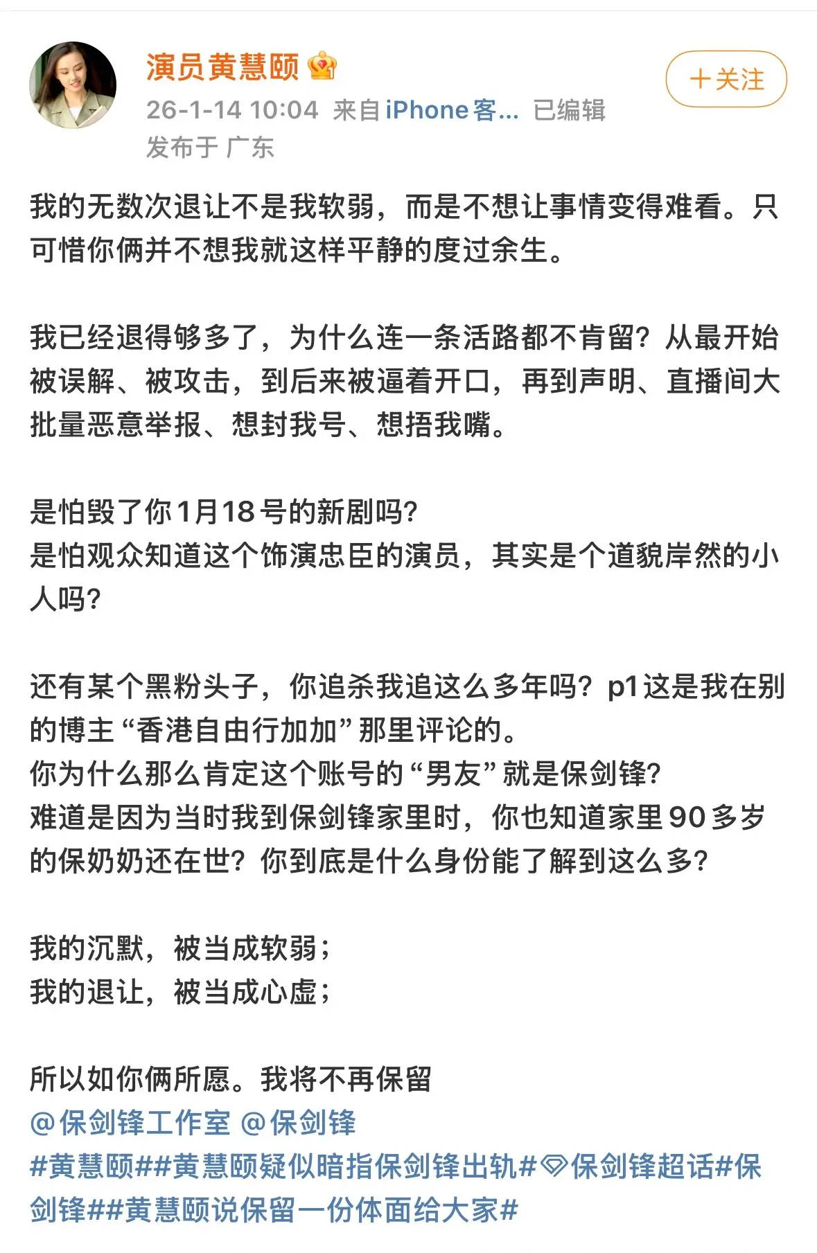 14日,演员黄慧颐在社交平台连发多条长文并晒出合影,再次指控保剑锋婚前出轨,并表示二人于2001年8月28日登记结婚,引发热议。部分文字如下:“我的无数次退让不是我软弱,而是
