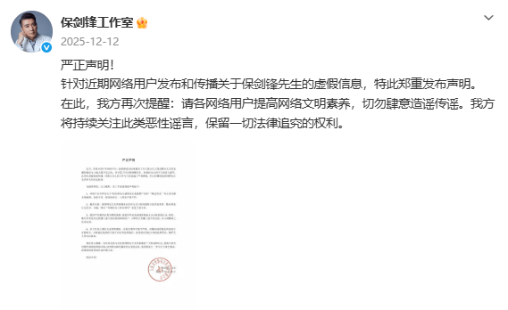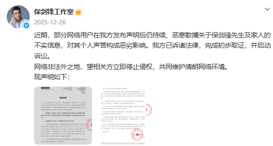 14日下午,保剑锋工作室再次针对此次事件发声:“最后一次声明,我们已委托律师就黄女士网络侵权言论提起民事诉讼,立案资料也已由律师提交法院。事实问题,大家法庭见,不浪费公共资源。我们理解法院因其严谨性、程序性等导致的流程较慢,也请大家耐心等待,予以理解。我们坚决支持网络清朗,拒绝任何形式的网络暴力与不当炒作! ”