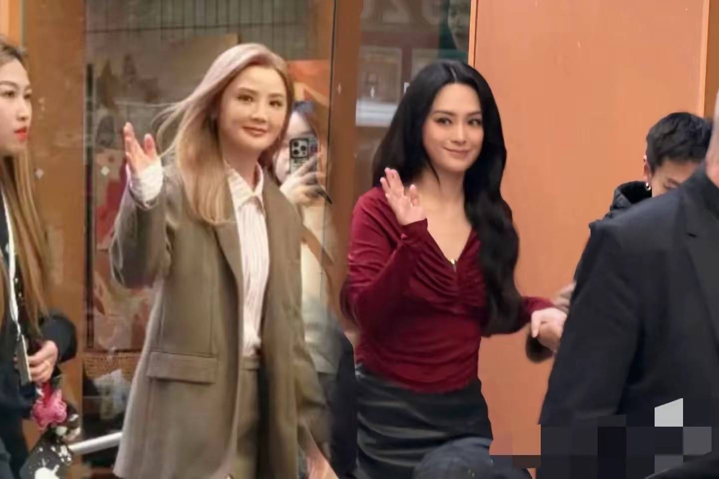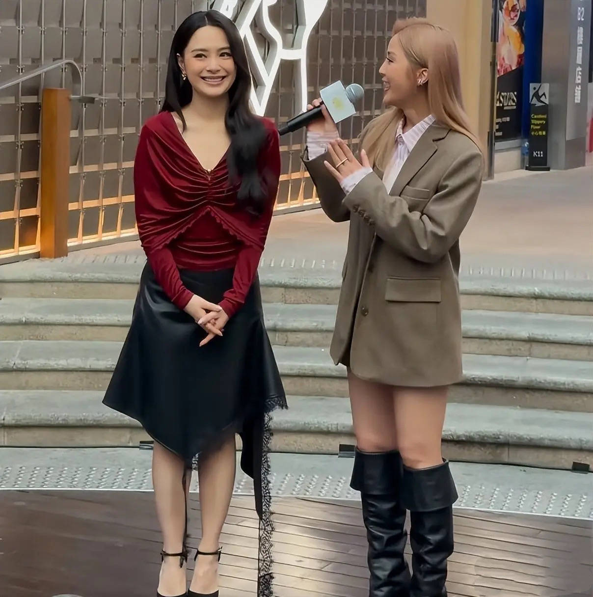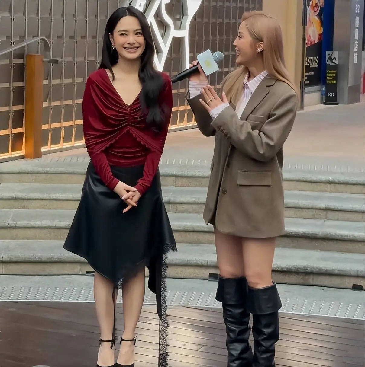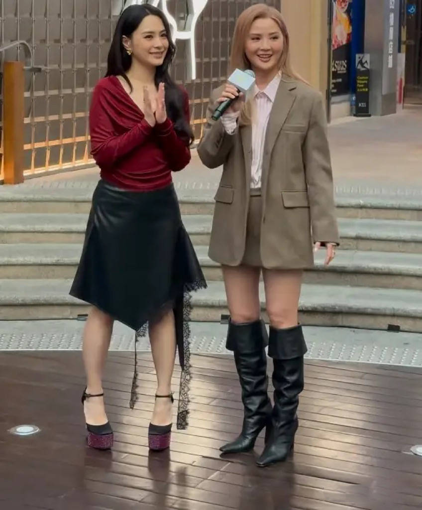 两个人的粉丝还是蛮多的,现场聚集了很多观众。阿娇一头大波浪的卷发,穿着红衣短裙明媚艳丽。