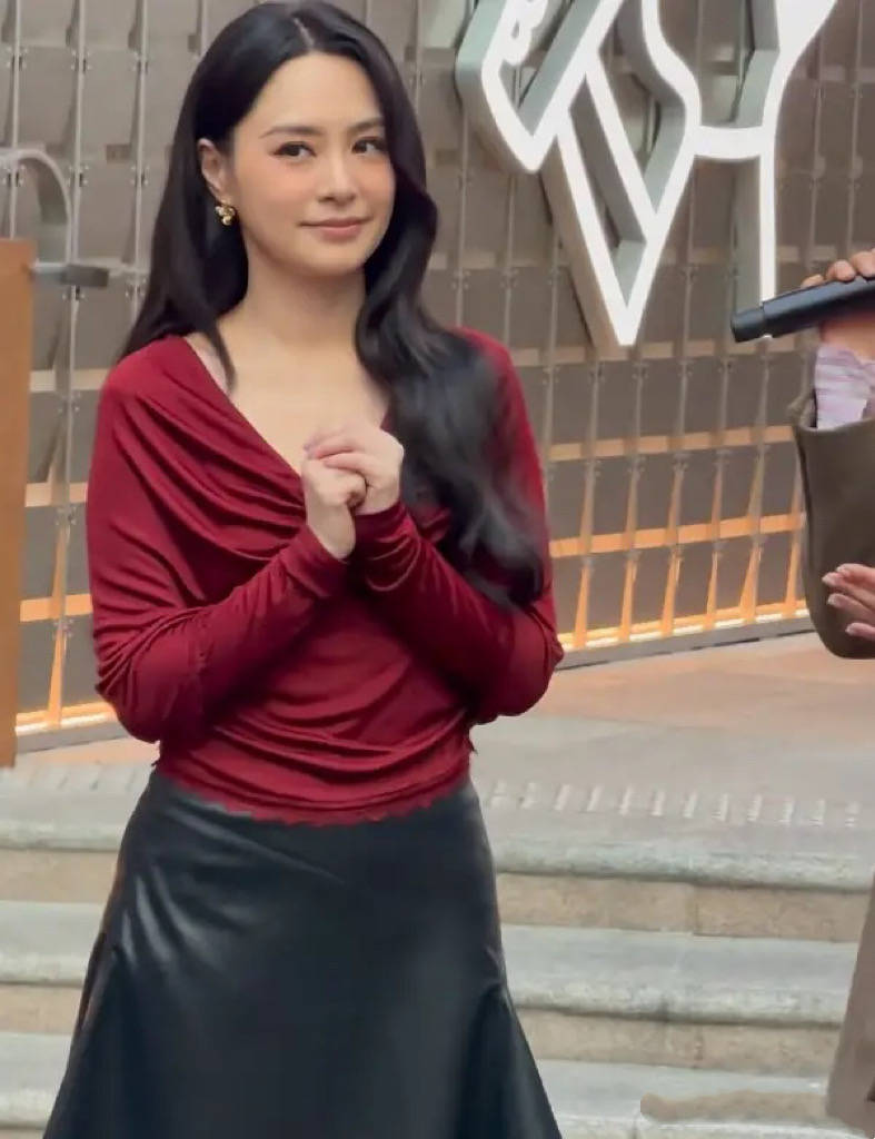 她穿一件红色丝绒上衣,小V领的设计露出精致的锁骨,显得脖颈修长。整个人都多了几分轻盈,是大方优雅的美丽。
