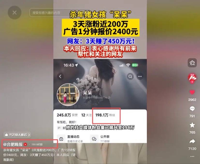 谁也没想到,小女孩一句求助的话,就引来了万千网友。而呆呆也从一个小透明,瞬间成为拥有百万粉丝的大网红,视频报价1分钟2400,直播间聚了3000万人,几天收入几百万。其实呆呆妹一开