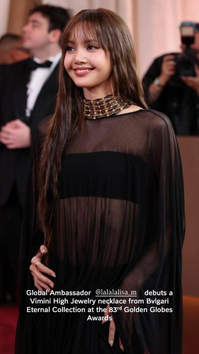 LISA 身穿 Jacquemus2026 春夏系列黑色薄纱透视长裙亮相金球奖红毯,瞬间成为全场焦点。