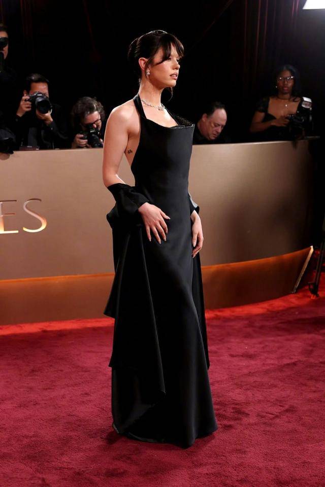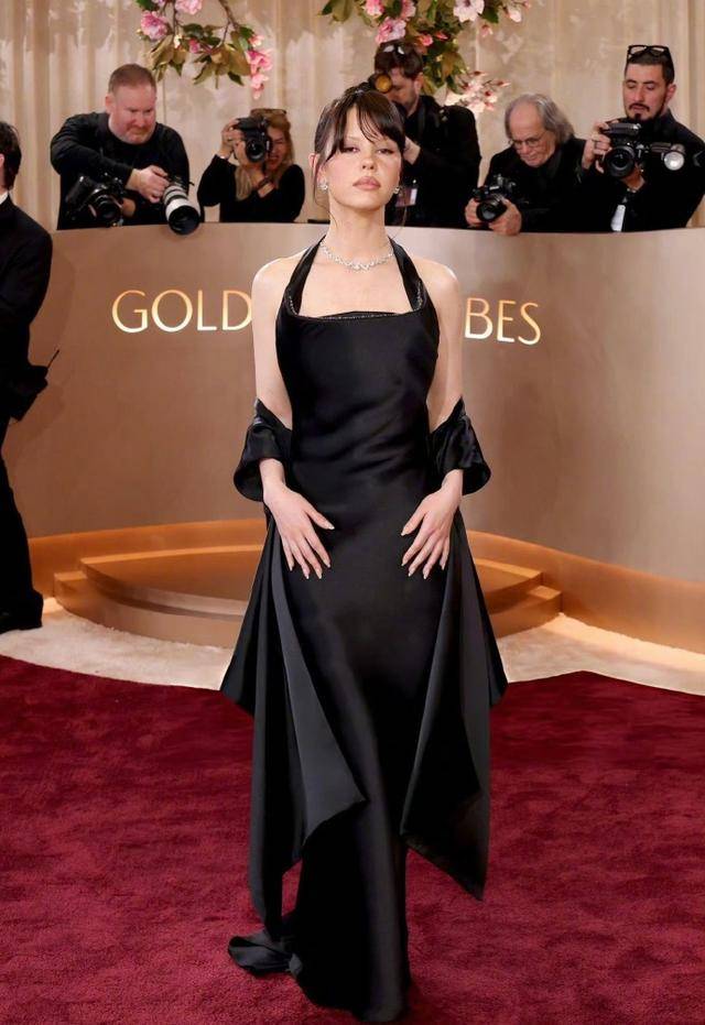 这条黑裙的设计简洁而不失大气,完美地展现了Mia Goth的身材曲线和优雅气质。