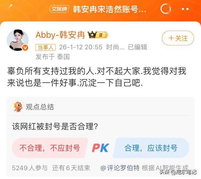 本以为账号被封之后她会低调一阵的时候,韩安冉在微博发文,先是道歉说辜负了支持她的人,然后话锋一转,觉得自己被封也是一件好事,能沉淀一下。