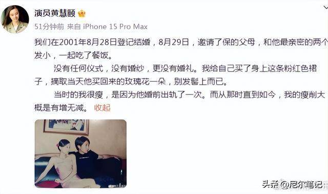 这话一放出来,网友还没反应过来,黄慧颐那边就接连发了两条微博,直接甩出猛料:俩人2001年8月28号就登记结婚了。