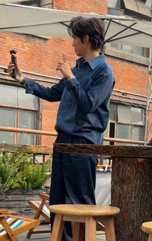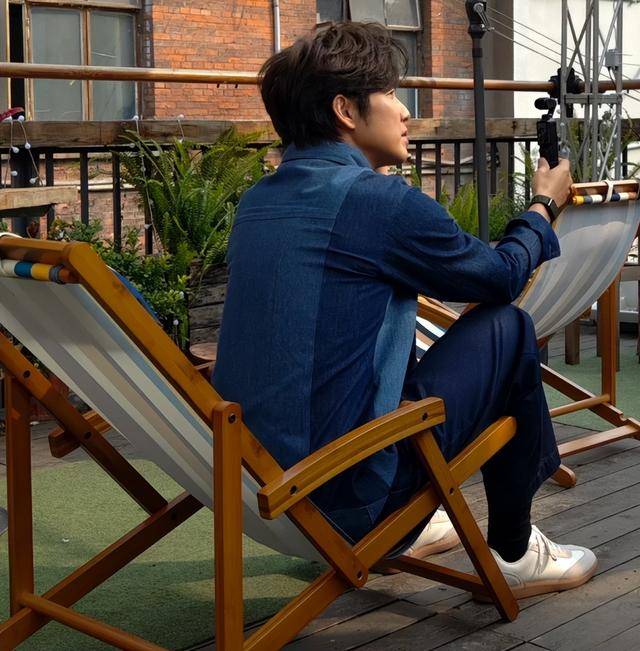 画面里的钟汉良穿着蓝色衬衫搭配白色内搭,下身是同色系休闲裤,脚上一双白色布鞋。