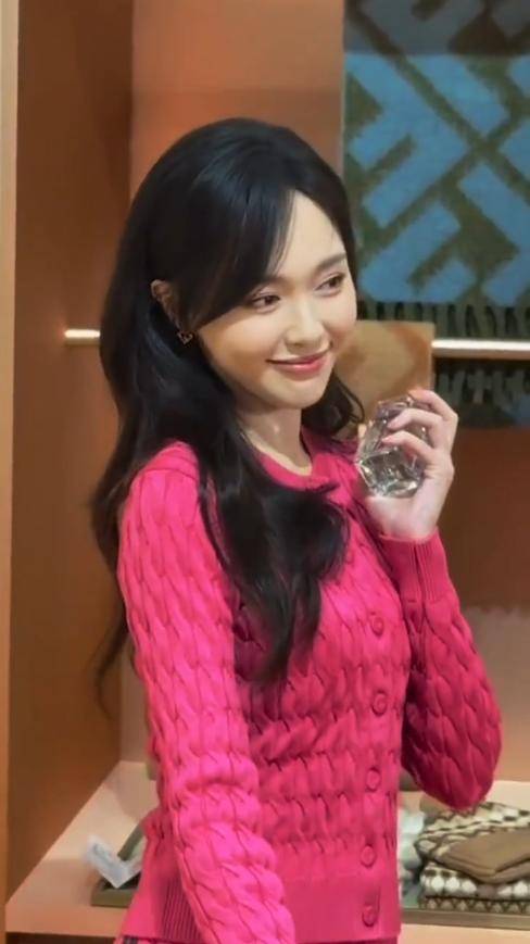 这次的粉色毛衣套装,更是将她的气质发挥到了极致。