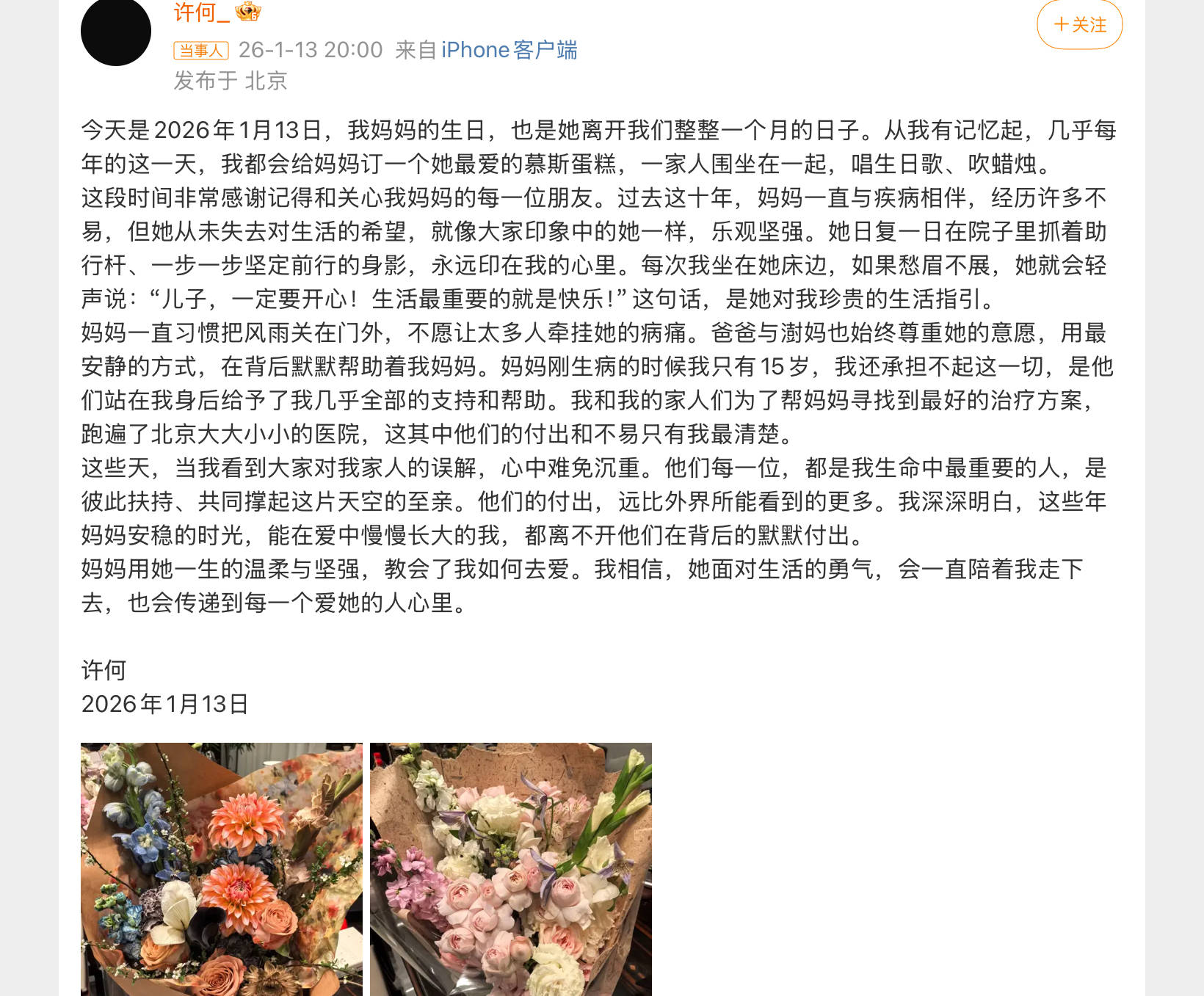 这枚黑头像也意外成了舆论的“放大镜”,一度让父亲许亚军陷入“失职”争议。早前有传言称“何晴手术时只有许何独自签字,许亚军带着新家庭度假”,葬礼上许亚军的缺席更让质疑声发酵。就在网友替许何抱不平之际,他的长文直接上演“舆论反转”:“爸爸与澍妈十年间一直默默支持,跑遍北京医院寻医,承担医疗费用”,还特意澄清葬礼缺席是因“需陪同幼子完成海外学术活动,实际远程操办了所有流程”。连继母张澍都被他亲切称作“澍妈”,直言其是“生命中最重要的人”,打破了重组家庭的刻板偏见。