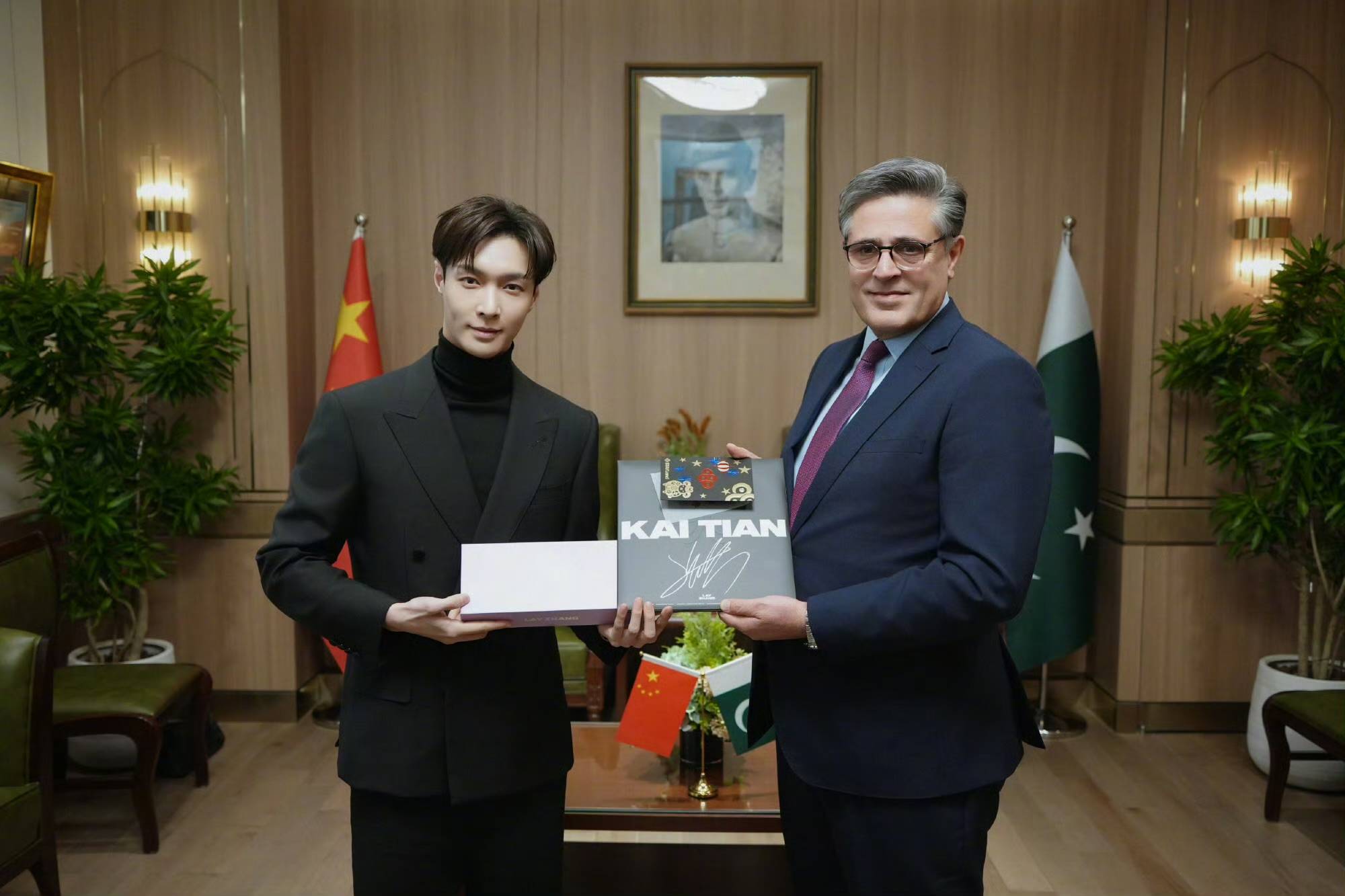 2026年1月13日,中巴建交75周年文化交流活动上,张艺兴的一套“文化送礼组合拳”直接引爆全网!和巴基斯坦驻华大使的三方合照里,背景是两国国旗,身前是跨越山海的心意互赠——大使送官方民俗画册,他回赠《开天》画胶+“小羊蹄”应援棒,配文“相知无远近,万里尚为邻”,网友笑称“这波文化输出,既硬核又可爱,不愧是内娱‘文化交流显眼包’”!