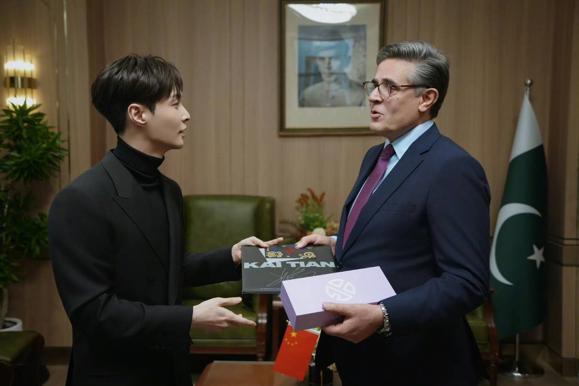 这场互赠礼物堪称“精准戳中文化共鸣”。巴基斯坦驻华大使卡里尔·哈什米送上的官方画册,全景展现巴国历史民俗,每页都是75年友好交往的见证,厚重又有分量。而张艺兴的回礼直接玩出新花样:《开天》画胶可不是普通专辑,以盘古开天神话为基底,编钟、唢呐等传统乐器混搭M-POP电子节拍,既藏着东方哲学的磅礴,又有现代音乐的潮酷,难怪媒体解读“这是把神话唱成了文化名片”。更绝的是搭配“小羊蹄”应援棒,这个粉丝圈人人皆知的标志性符号,居然跟着专辑一起登上外交舞台,网友调侃“小羊蹄:没想到我有一天能当‘文化使者’,还是跨国级别的”。
