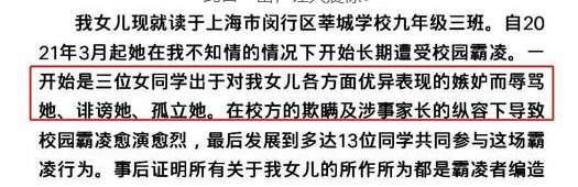 邵一卜妈妈发文称,自己的女儿因为学习成绩好,而且还是童星,各方面表现都很优秀,因此遭受了其他同学的嫉妒。他们对邵一卜诽谤、辱骂、孤立,多达13位同学参与到这场霸凌行为中,最终导致女儿患上了抑郁症,结束了自己的生命。