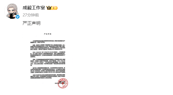 14日,成毅工作室在社交平台上发布严正声明,透露成毅及家人持续遭受个别人员的跟踪与骚扰,实施包括但不仅限于尾随、围堵、在马路上追赶并试图逼停车辆等行为,甚至车辆遭到恶意喷洒红漆、收到人身威胁邮件。工作室已向公安机关要求采取必要措施,也将拿起法律武器维权。