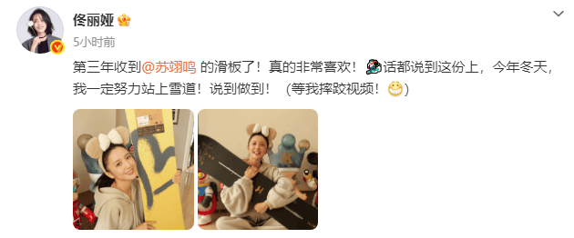 14日,佟丽娅在社交平台上晒出自己抱着滑板的照片,并发文称:“第三年收到苏翊鸣的滑板了!真的非常喜欢!话都说到这份上,今年冬天,我一定努力站上雪道!说到做到!(等我摔跤视频!)”