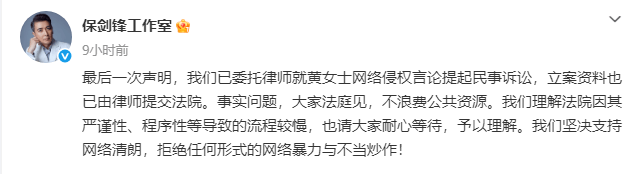 此前,黄慧颐说保剑锋婚前出轨,两人领证但没办婚礼等,引起热议。对此,保剑锋工作室发布最后一次声明,已委托律师就黄慧颐网络侵权言论提起民事诉讼,立案资料也已由律师提交法院。
