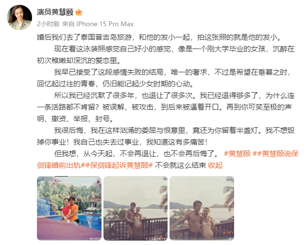 14日,黄慧颐在社交平台上晒出婚后和保剑锋去普吉岛旅游的合照,并发文喊话保剑锋:“我已经退得够多了,为什么连一条活路都不肯留?被误解、被攻击,到后来被逼着开口。再到你可笑至极的声明、撤资、举报、封号。我很后悔,我在这样汹涌的委屈与恨意里,竟还为你留着半盏灯。我不想毁掉你事业!我自己也失去过事业,我知道这有多痛苦!但我想,从今天起,不会再退让,也不会再后悔了。”