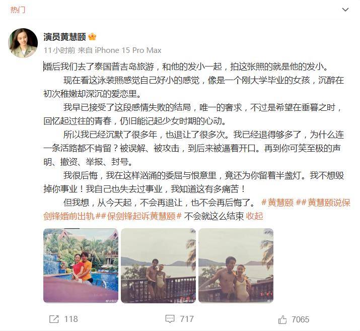 1月14日晚,演员黄慧颐的一波操作,让沉寂多年的娱乐圈“古早CP”猝不及防地炸上了热搜。她不仅晒出与保剑锋在普吉岛的旅游旧照,更配上一篇火药味十足的“宣战书”,直言“从今天起不会再退让”,将一场持续数月的私下纠葛彻底摊在了公众眼前。