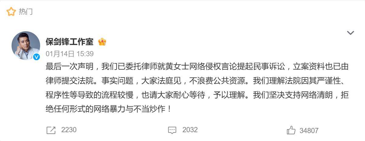 面对如此猛烈的指控,保剑锋工作室的反应堪称“雷霆速度”。同日下午,工作室发出“最后一次声明”,全盘否认出轨、隐婚等所有指控,并亮出法律武器——已正式委托律师就黄慧颐的网络侵权言论提起民事诉讼,立案材料已提交法院。“事实问题,大家法庭见,不浪费公共资源。”态度强硬,不留丝毫转圜余地。据悉,这已是保剑锋方自2025年12月以来的第三次声明及法律行动,但黄慧颐此前称从未收到律师函,双方各执一词,陷入罗生门。