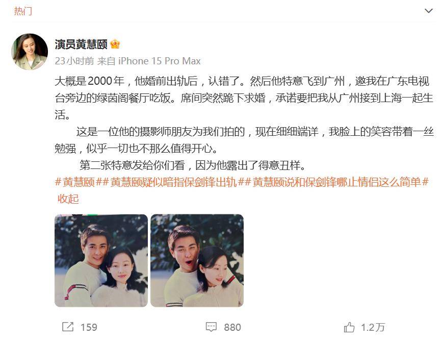 这已不是双方第一次交锋。此前,“黄慧颐指控保剑锋出轨”、“保剑锋起诉黄慧颐”等话题就曾几度掀起波澜。而这一次,黄慧颐抛出了更具体的“炸弹”:她声称两人早在2001年8月28日就已秘密登记结婚,起因是保剑锋出轨被抓包后,飞赴广州当众下跪求婚。她晒出的两张旧照中,自己笑容勉强,而保剑锋则被她形容为“得意丑样”。这场没有婚纱、没有婚礼,仅双方父母和发小见证的“隐婚”,成了她指控的核心证据。
