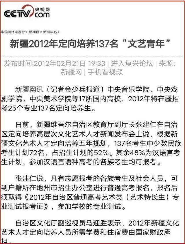 从那篇报道的内容中可以看到,2012年的时候,中央音乐学院、中央戏剧学院、中央美术学院等17所国内高校,曾经在新疆地区招考25个专业,总共招收了137名定向培养生。