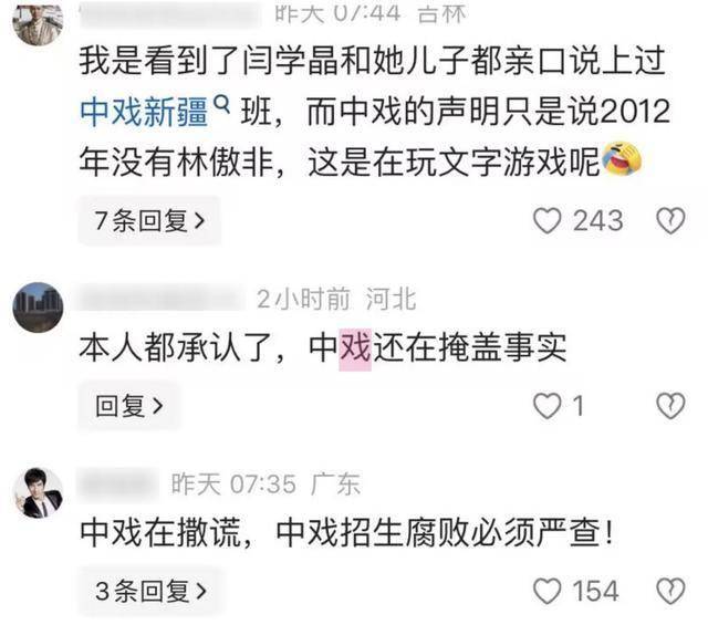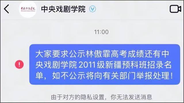 有网友尝试通过私信的方式联系中戏,希望学校方面能够公开林傲霏的高考成绩以及当年新疆预科班的招录名单。