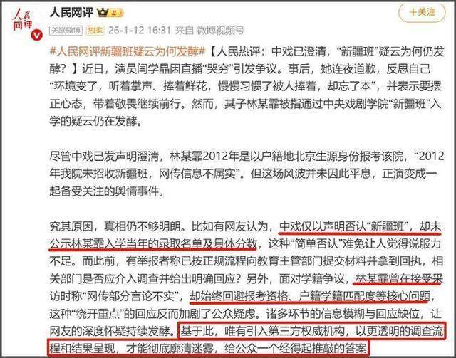 人民网在1月13日发布了一篇名为《中戏已澄清,“新疆班”疑云为何仍发酵?》的评论文章。