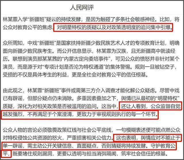 人民网在文章中还特别强调了一点:中戏仅仅否认存在新疆班,是不足以让真相变得明朗的,应当公示林傲霏的入学成绩和当年的录取名单。