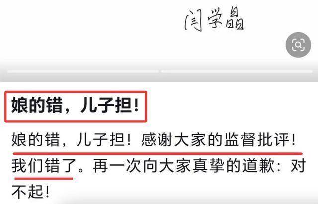 “娘的错,儿来担!”这句话是林傲霏在1月12日发出来的,当时他转发了母亲闫学晶的道歉声明,想要展现出一副母慈子孝的温情画面。但让人没有料到的是,这句话竟然一语成